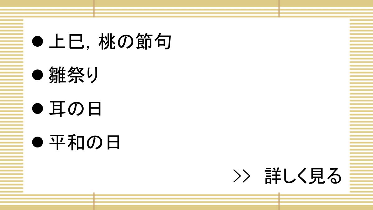 女の子の健やかな成長を願う伝統行事。女の子のいる家庭では、雛人形を飾り、白酒・菱餅・あられ・桃の花等を供えて祀る。上巳の日には、人形に穢れを移して川や海に流していたが、その人形が次第に精巧なものになって流さずに飾っておくようになり、雛祭りとして発展して行った。雛祭りは始めは宮中や貴族の間で行われていたが、やがて武家社会でも行われるようになり、江戸時代には庶民の行事となった。元々は、5月5日の端午の節句とともに男女の別なく行われていたが、江戸時代ごろから、豪華な雛人形は女の子に属するものとされ、端午の節句は菖蒲の節句とも言われることから、「尚武」にかけて男の子の節句とされるようになった。