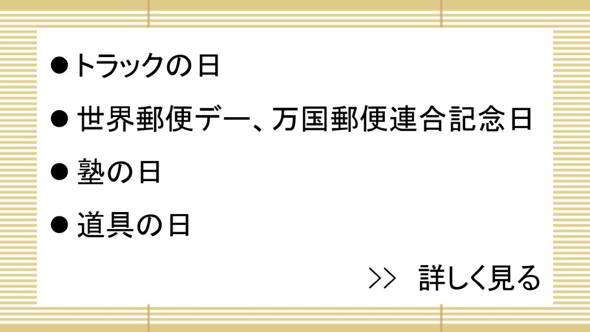 万国郵便連合(UPU)が1969(昭和44)年に「UPUの日」として制定。1984(昭和59)年に「世界郵便デー」と名称を変更した。1874(明治7)年、全世界を一つの郵便地域にすることを目的に、万国郵便連合が発足した。日本は1877(明治10)年2月19日に加盟した。