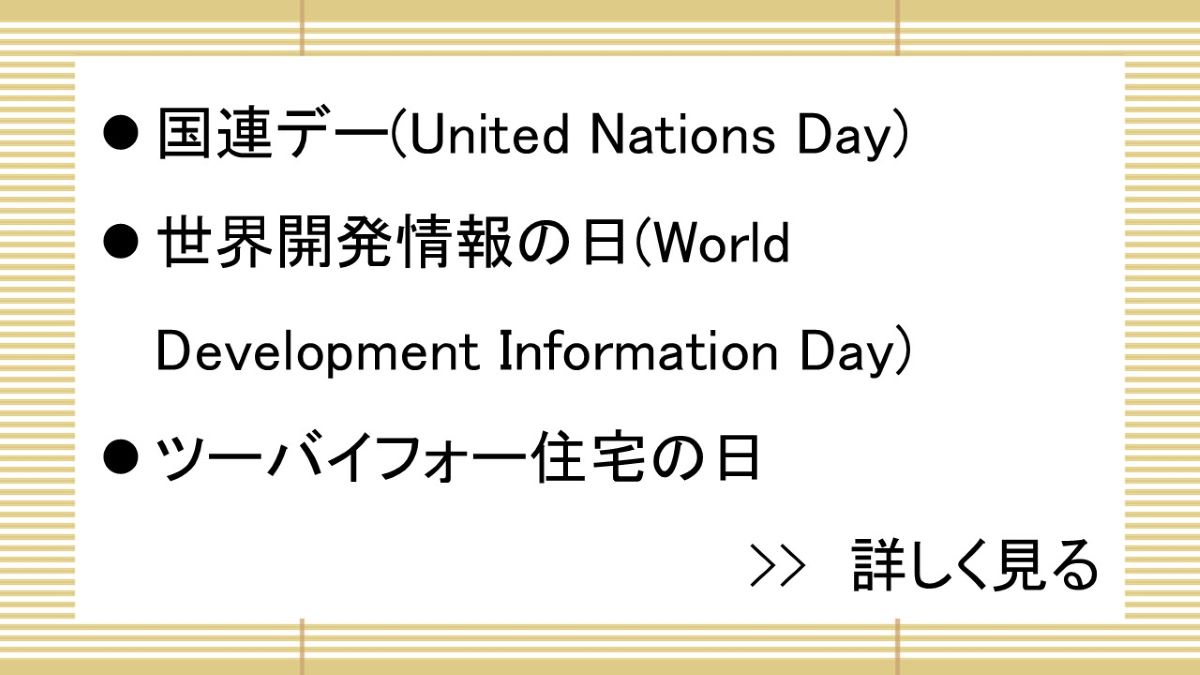 国際デーの一つ。1948(昭和23)年から実施。1945(昭和20)年、ソ連の国際連合憲章への批准により、発効に必要な20か国の批准が得られたため、国連憲章が発効し、国際連合が発足した。日本は1956(昭和31)年に加入が認められた。1971(昭和46)年の国連総会で、国連加盟国はこの日を公的な休日として記念するよう勧告された。