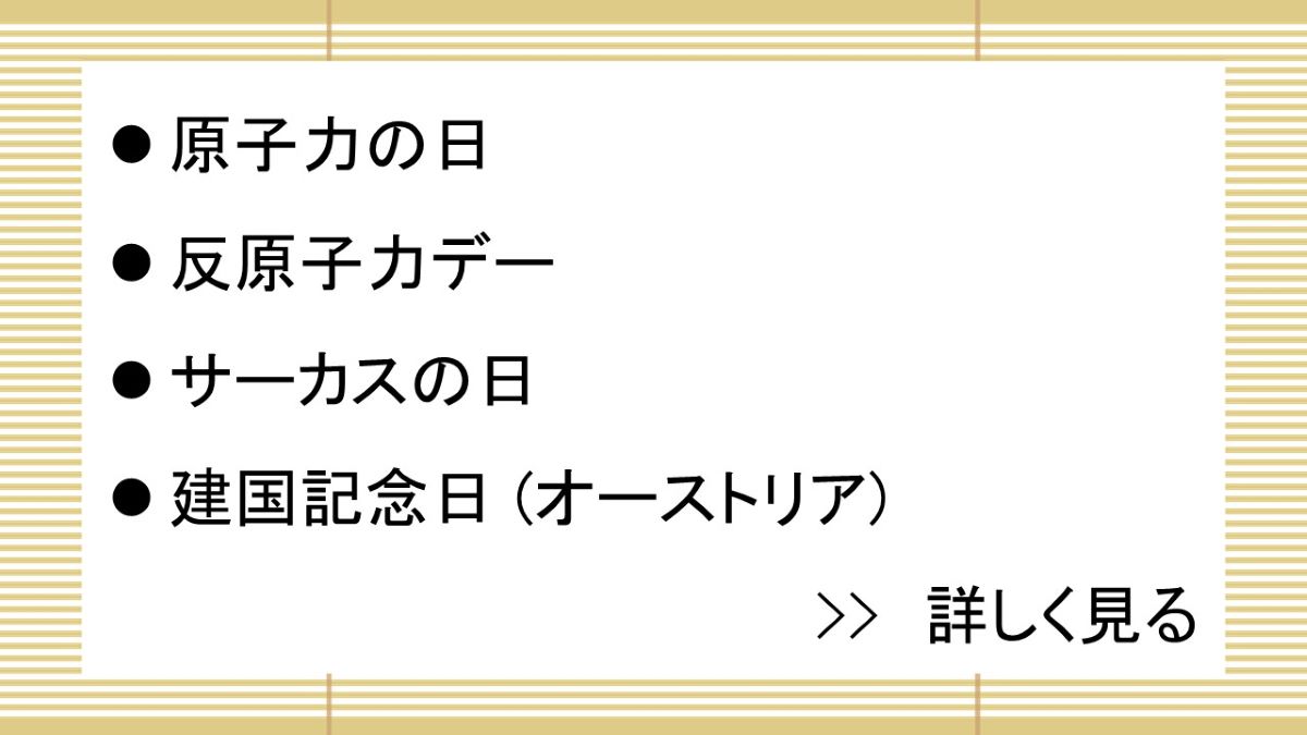 科学技術庁(現在の文部科学省)が1964(昭和39)年に制定。1963(昭和38)年、茨城県東海村の日本原子力研究所で、日本初の原子力発電が行われた。また、1956(昭和31)年のこの日には日本が国際原子力機関(IAEA)に加盟した。