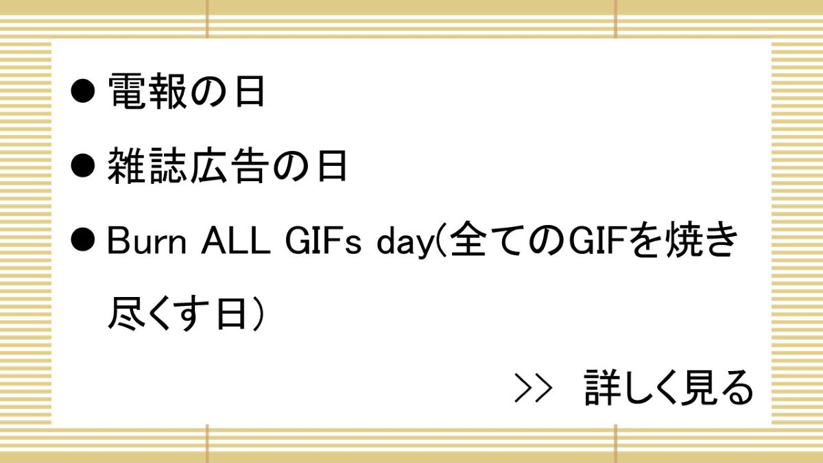 1999(平成11)年から実施。画像フォーマットとして広く使用されているGIFには、LZWという圧縮アルゴリズムが使われている。このLZWの特許を持っているアメリカのユニシスという会社は、当初はLZWを自由に使って良いという立場をとっており、GIFフォーマットにもこの圧縮方式が採用された。しかし、GIFを始めとしてLZWが広く普及したのを見て、ユニシスは、LZWの使用者に対し特許使用料の支払いを求めるようになり、最近では、GIF画像を張り附けているWebページの所有者に対しても使用料を請求するようになった。これに反発する人たちが、GIFの使用をとりやめてPNG(ピング)やJPEG等への置き換えを推奨する為に、この日を制定した。
