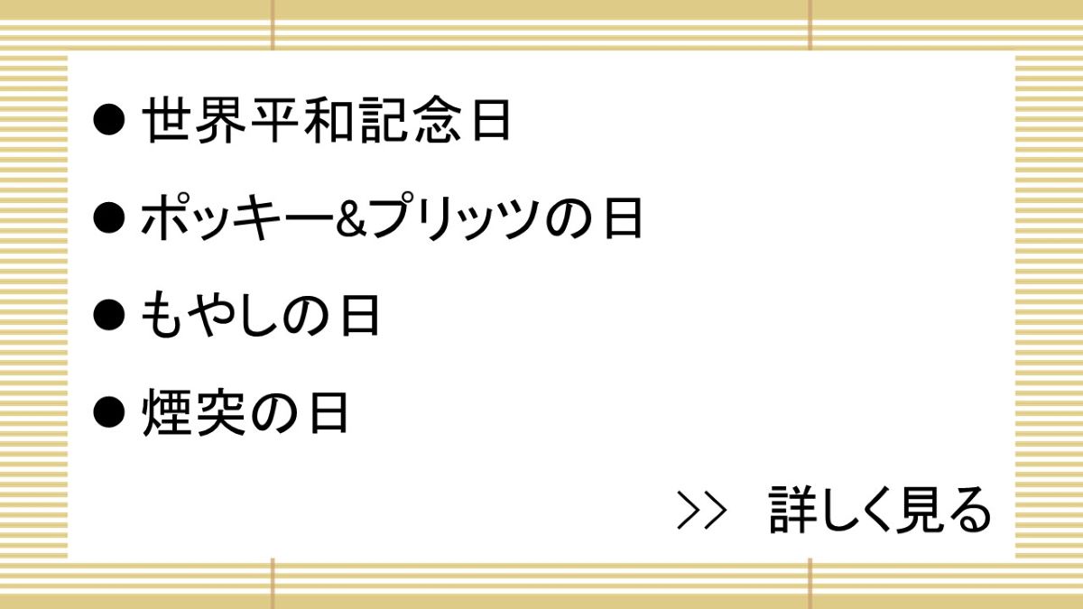 日本靴下協会が1993(平成5)年に制定。 靴下を2足並べた時の形が11 11に見えることから。1年で1度同じ数字のペアが重なる日であることから、恋人同士で靴下を贈り合おうと呼びかけている。