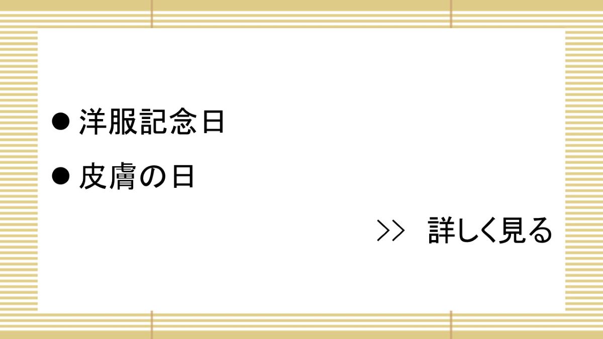 東京都洋服商工協同組合が1929(昭和4)年に制定。これとは別に、全日本洋服協同組合連合会が1972(昭和47)年に制定。1872(明治5)年、「礼服ニハ洋服ヲ採用ス」という太政官布告が出され、それまでの公家風・武家風の和服礼装が廃止された。