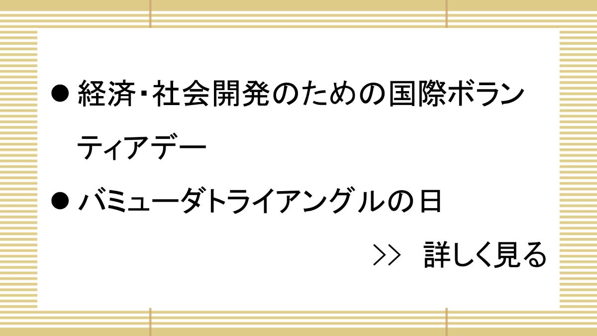 国際デーの一つ。 世界中の経済と社会開発の推進のため、ボランティア活動の貢献に対する認識を高め、社会のあらゆる層からより多くの人々が、国内外においてボランティア活動に参加できる機運を高める日。