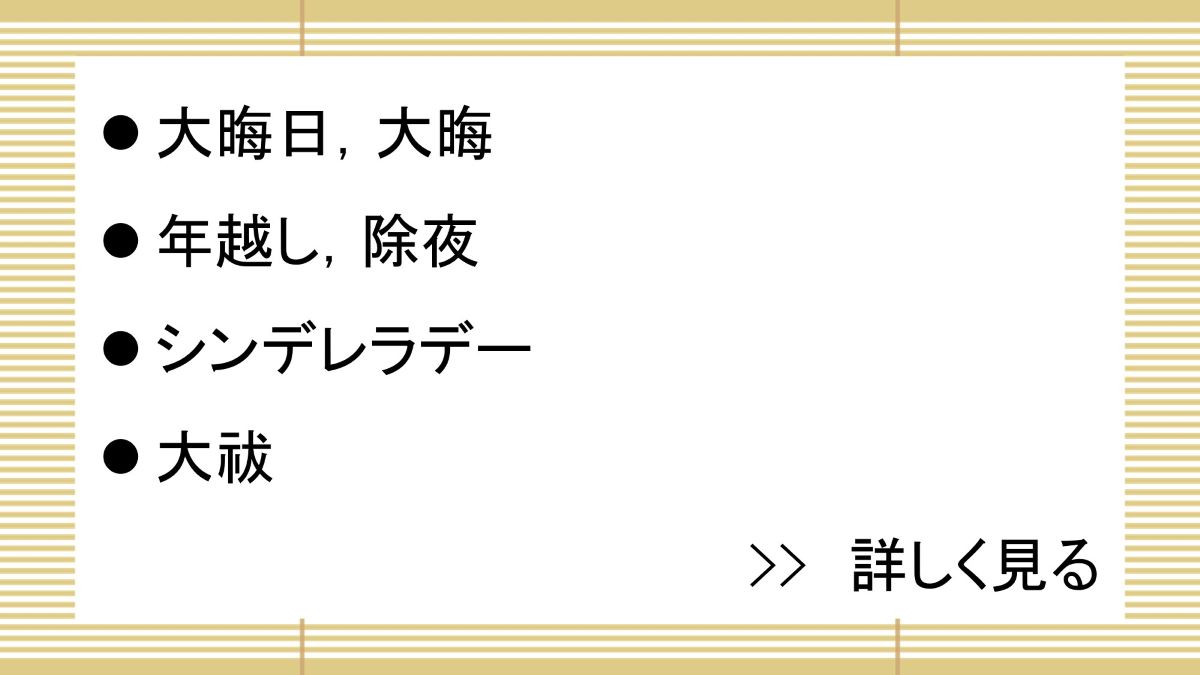 1年の終りの日。年越し蕎麦を食べる習慣は江戸時代中期から始ったものである。元々月末に蕎麦を食べる習慣があり、大晦日のみにその習慣が残った。金箔職人が飛び散った金箔を集めるのに蕎麦粉を使ったことから、年越し蕎麦を残すと翌年金運に恵まれないと言われる。除夜の鐘は108回撞かれる。眼・耳・鼻・舌・身・意の六根のそれぞれに苦楽・不苦・不楽があって18類、この18類それぞれに浄・染があって36類、この36類を前世・今世・来世の三世に配当して108となり、これは人間の煩悩の数を表すとされている。また、月の数12、二十四節気の数24、七十二候の数72を足した数が108となり、1年間を表しているとの説もある。