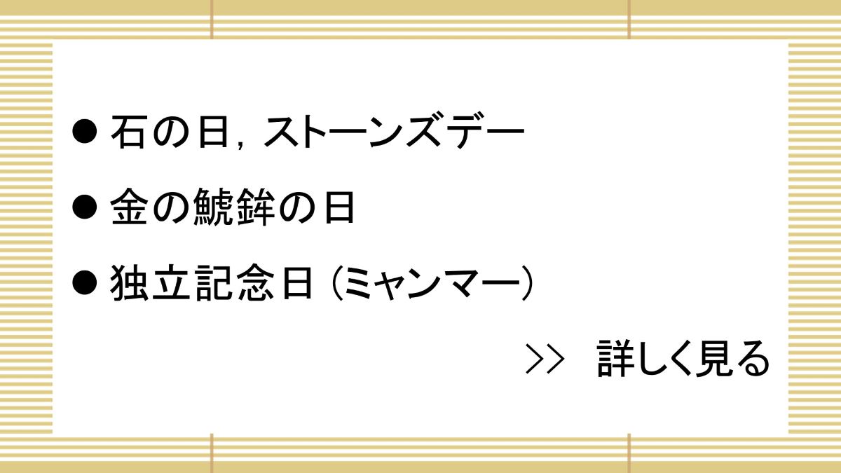 「い(1)し(4)」の語呂合せ。この日に、地蔵・狛犬・墓石など願いがかけられた石に触れると、願いが叶うと言われている。