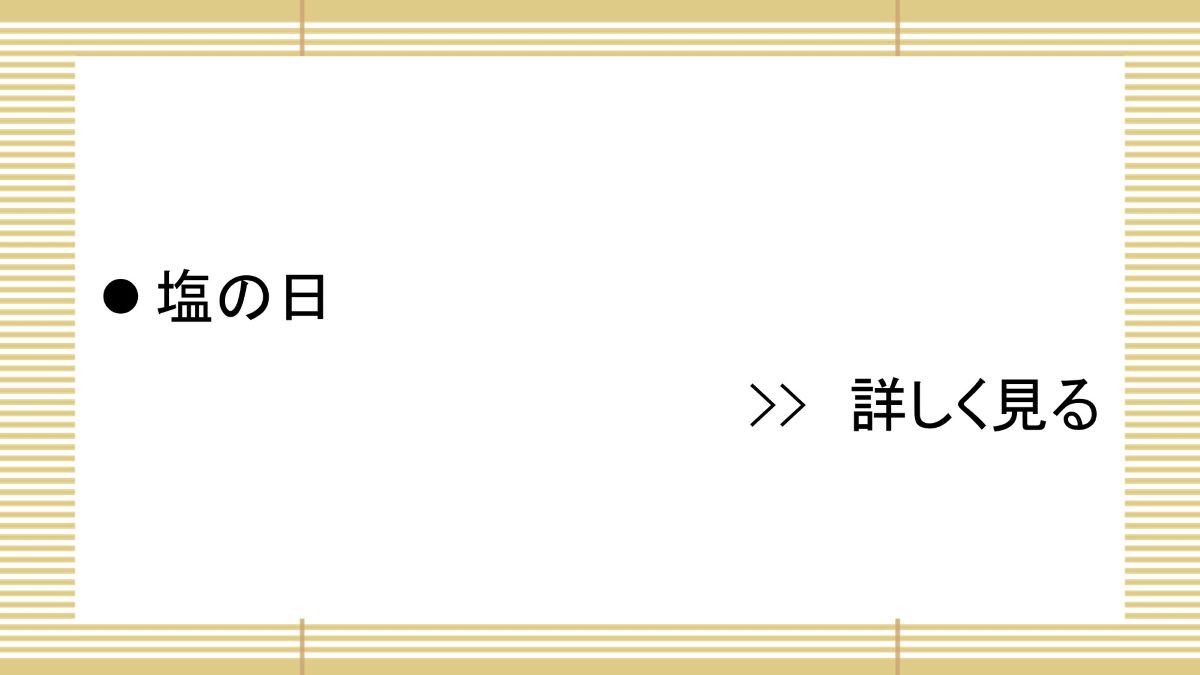 01月11日 今日は何の日 2026.01.11 01月11日 今日は何の日 塩の日 1569(永禄11)年の、武田信玄と交戦中の上杉謙信が、武田方の領民が今川氏によって塩を絶たれていることを知り、この日、越後の塩を送ったとされている。この話が、「敵に塩を送る」という言葉のもととなった。